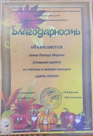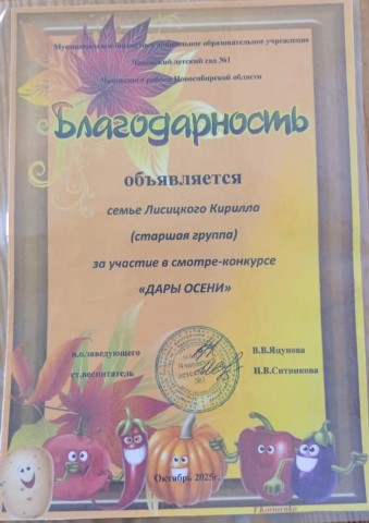 Грамота А.Арсения 3 место в конкурсе-выставке "Осенние фантазии" в номинации "Огородно-дачные достижения" |