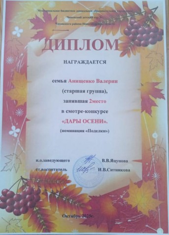 Грамота С.Артура 3 место в конкурсе-выставке "Осенние фантазии" в номинации "Совушка-сова" |