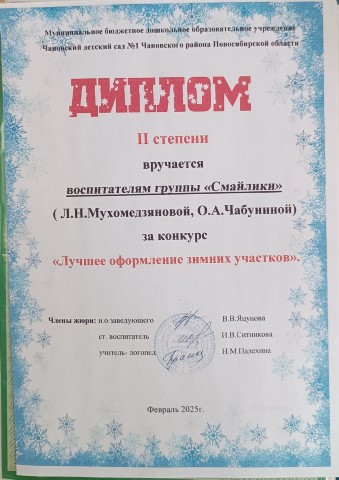 Диплом средней группы 2 место в смотре-конкурсе на лучший зимний участок