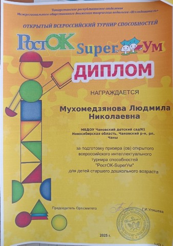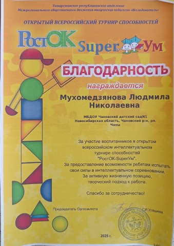 Благодарность за участие воспитанников в открытом всероссийском интеллектуальном турнире способностей "РостOK-SuperУм |