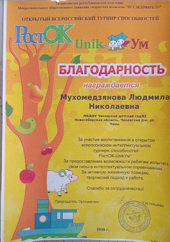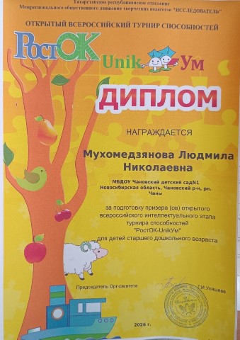Диплом за подготовку призера(ов) открытого Всероссийского интеллектуального турнира способностей "РостОК-UnikУм" для детей старшего дошкольного возраста |
