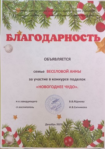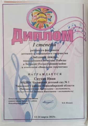 Диплом 1 степени за участие в районном фестивале детско – юношеского творчества «Звездный дождь» в номинации вокальное творчество 2025 год |
