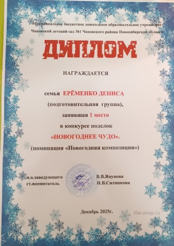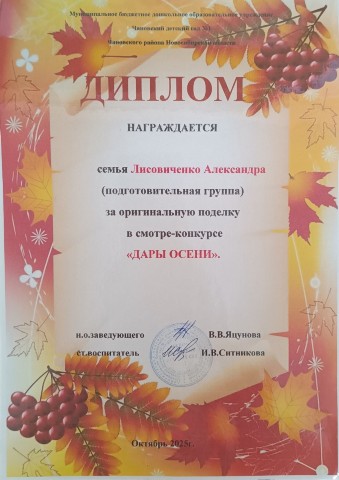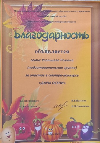 Грамота 1 место М.Егора в конкурсе-выставке "Осенние фантазии" в номинации "Лучшая аппликация", 10.2019г |