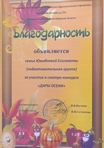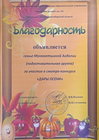 Грамота 1 место Ш.Софьи в конкурсе-выставке "Осенние фантазии" в номинации "Необыкновенный букет", 10.2019г |