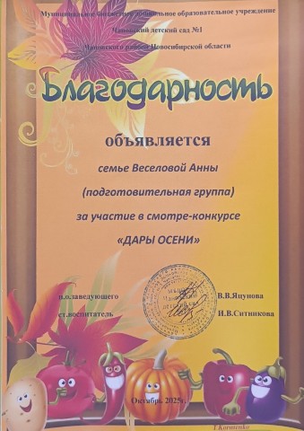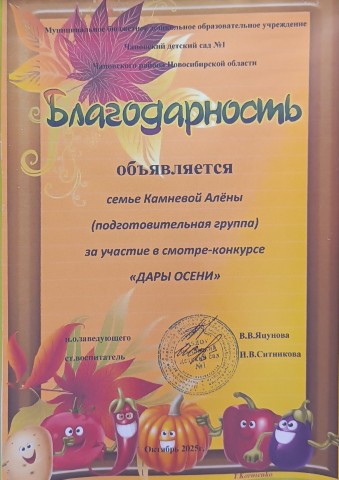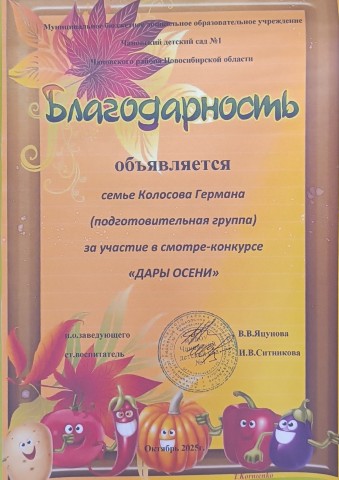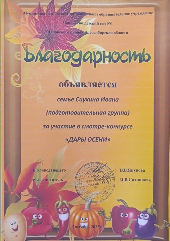 Грамота 1 место К.Сергея в конкурсе-выставке "Осенние фантазии" в номинации "Огородно-дачные достижения", 10.2019г |