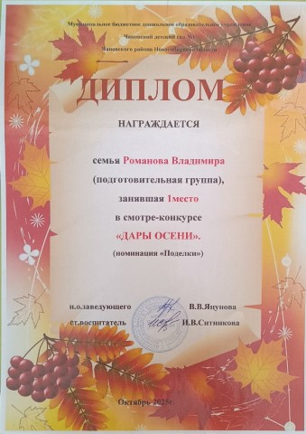 Грамота 3 место К.Романа в конкурсе-выставке "Осенние фантазии" в номинации "Лучшая композиция", 10.2019г |