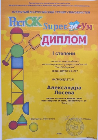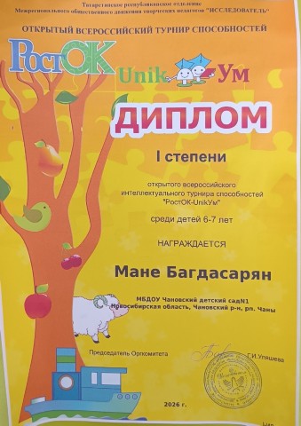 Диплом 1 степени в открытом всероссийском турнире способностей "РостОК-UnikУм" |
