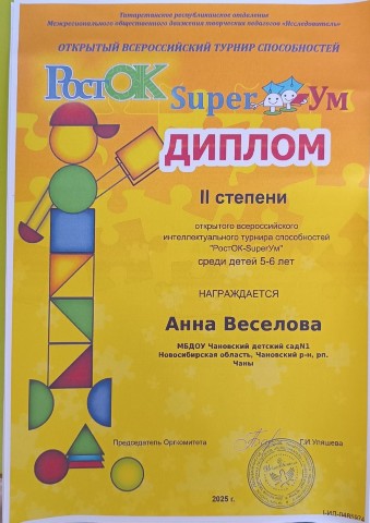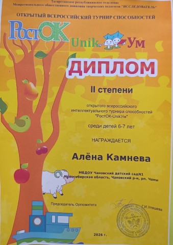 Диплом 2 степени в открытом всероссийском турнире способностей "РостОК-UnikУм" |