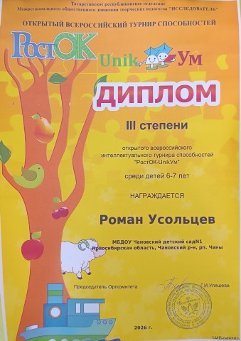 Диплом 3 степени в открытом всероссийском турнире способностей "РостОК-UnikУм" |