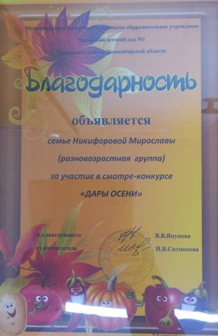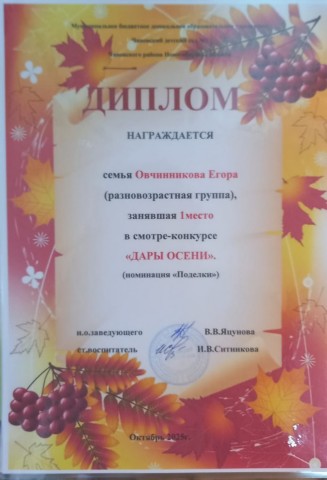 Диплом 1 место в конкурсе поделок "Дары осени" |