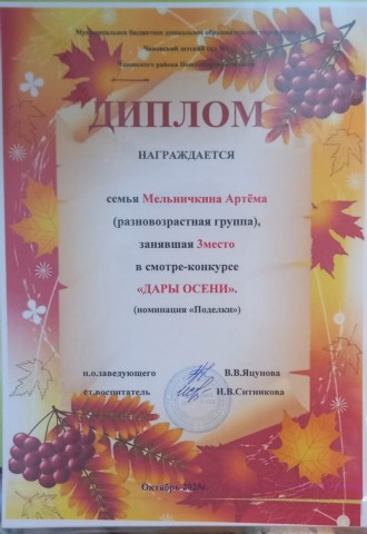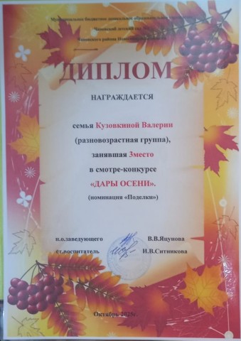 Диплом 3 место в конкурсе поделок "Дары осени" |