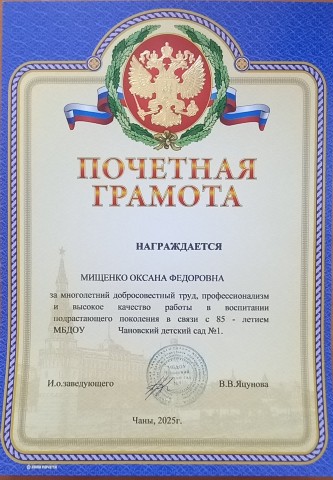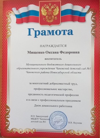 Почетная грамота за высокое профессиональное мастерство, добросовестный труд и большой вклад в дело развития, воспитания и образования подрастающего поколения от Начальника управления образования администрации Чановского района