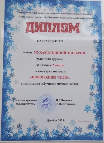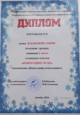 Диплом 2 место за участие в конкурсе «Лучшее новогоднее оформление зимнего участка»
