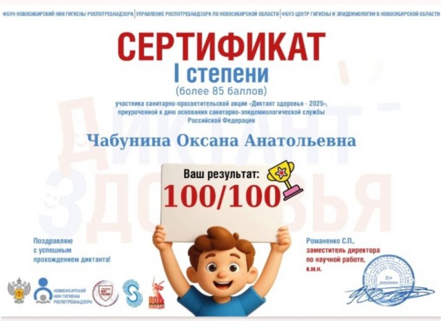 Почетная грамота за высокое профессиональное мастерство, добросовестный труд и большой вклад в дело развития, воспитания и образования подрастающего поколения от Начальника управления образования администрации Чановского района |