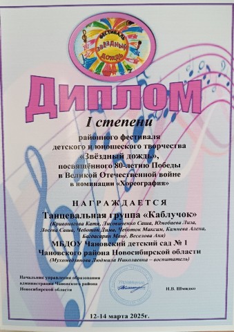 Диплом 1 степени за участие в районном фестивале детско – юношеского творчества «Звездный дождь» в номинации хореография 2025 год |