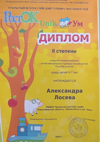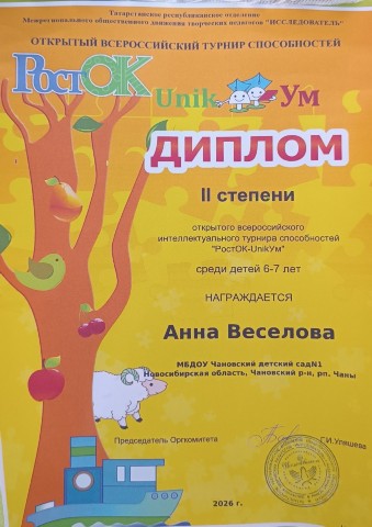 Диплом 2 степени в открытом всероссийском турнире способностей "РостОК-UnikУм"