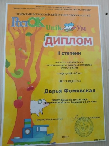 Диплом 2 степени в открытом всероссийском турнире способностей "РостОК-UnikУм" |