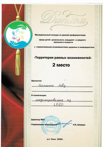 Диплом 2 степени Муниципальный конкурс по ранней профориентации среди детей с ограниченными возможностями здоровья и инвалидностью в компетенции "Моделирование из LEGO" |