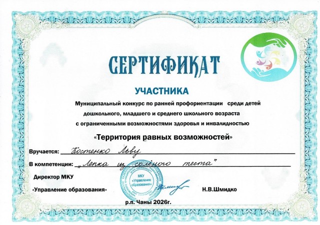 Сертификат Муниципальный конкурс по ранней профориентации среди детей с ограниченными возможностями здоровья и инвалидностью в компетенции "Лепка из соленого теста" |
